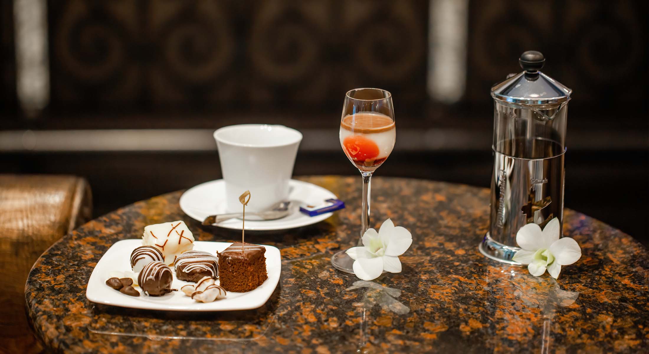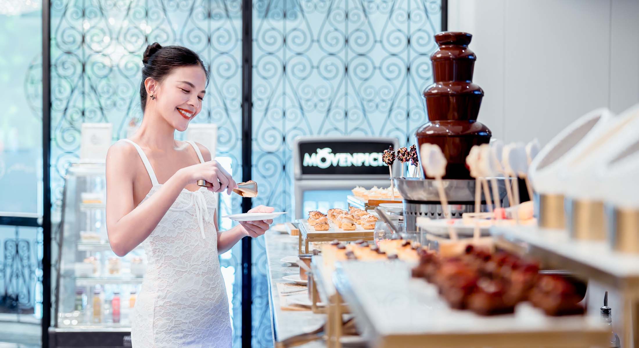 ตั้งแต่เวลา 15.00 – 16.00 น. ดื่มด่ำกับน้ำพุช็อกโกแลตสวิสที่ไหลรินไม่อั้น เสิร์ฟคู่กับผลไม้สดและขนมอบหลากหลายชนิด ท่ามกลางบรรยากาศสถาปัตยกรรมชิโน–โปรตุกีสอันสง่างาม ไม่ว่าจะเป็นการจุ่มสตรอว์เบอร์รีลงในช็อกโกแลตเข้มข้น การเก็บภาพความประทับใจกับมาสคอต หรือการชมการแสดงไทยอันอ่อนช้อย ชั่วโมงแห่งความสุขกับช็อกโกแลต จึงไม่ใช่เพียงช่วงเวลาแห่งของหวาน แต่คือความทรงจำแสนพิเศษที่ควรค่าแก่การจดจำ