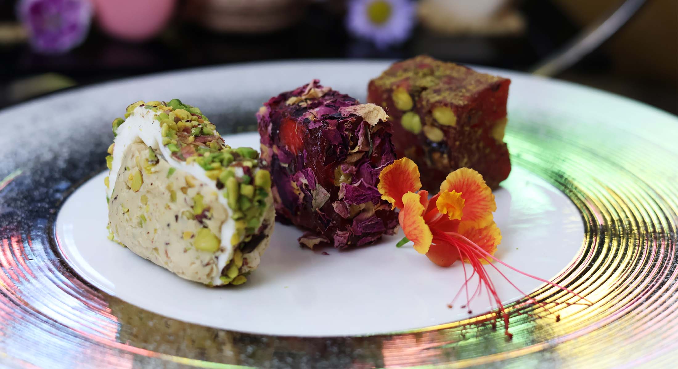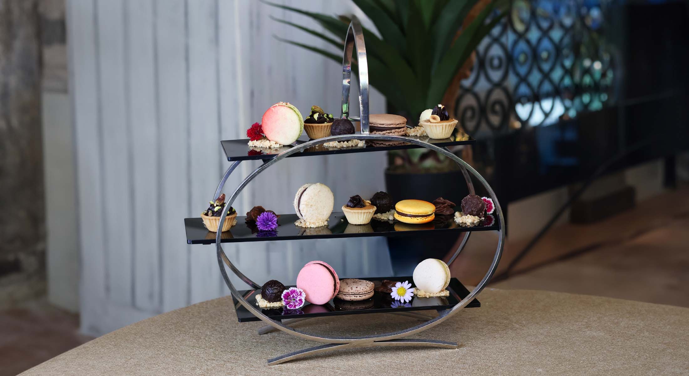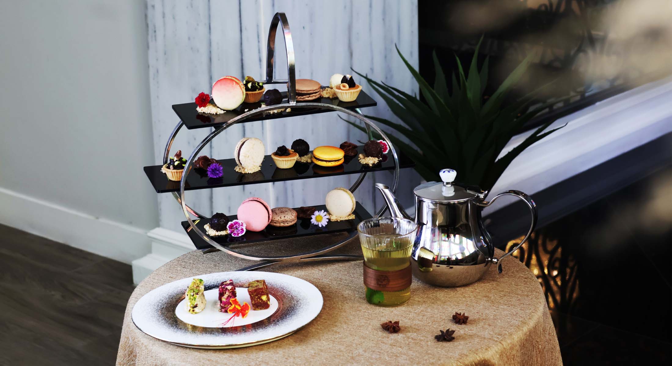 ชุดน้ำชาสไตล์ตะวันออกประกอบด้วยมาการองฝรั่งเศสเนื้อละมุน ผสานกับขนมหวานแบบตุรกีดั้งเดิม จับคู่กับชาพรีเมียมอย่างพิถีพิถัน ทุกองค์ประกอบสะท้อนการผสมผสานของวัฒนธรรม รสชาติ และงานฝีมืออย่างกลมกลืน มอบประสบการณ์น้ำชายามบ่ายที่หรูหรา แตกต่างจากรูปแบบดั้งเดิมอย่างมีระดับ